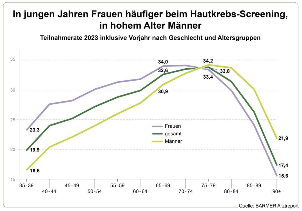Berlin, 16. März 2026 – Etwa 70 Prozent der anspruchsberechtigten GKV-Versicherten in Deutschland nutzen das alle zwei Jahre mögliche Hautkrebs-Screening nicht. Das waren bezogen auf die Jahre 2022 und 2023 jeweils rund 34 Millionen Personen. Dies geht aus dem BARMER-Arztreport hervor. Trotz des seit dem Jahr 2008 bestehenden Anspruchs auf eine kostenlose Früherkennungsuntersuchung alle zwei Jahre nahmen im Jahr 2023 oder im Vorjahr lediglich 27,9 Prozent der gesetzlich Versicherten ab 35 Jahren, beziehungsweise 13,1 Millionen Personen, diese Vorsorgeuntersuchung wahr. „Das Hautkrebs-Screening ist wichtig für die Früherkennung und erfolgreiche Behandlung von Hautkrebs. Die aktuellen Zahlen zeigen jedoch, dass wir von einer optimalen Vorsorge noch weit entfernt sind“, sagt Prof. Dr. med. Christoph Straub, Vorstandsvorsitzender der BARMER. Die Auswertung zeige, dass bei den Screenings erhebliche Unterschiede je nach Alter, Geschlecht und Bildung bestünden.